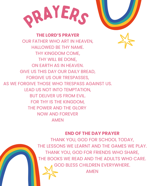 Saying prayers together is an important part of everyday life at St Clement’s CEP. We say different prayers at different times of the day, and it would be useful if you could help your child to learn them. During worship we also encourage the children to make up and say their own prayers so that they recognise that they can have their own conversations with God whenever they like – these often go along the lines of: thanking God for something, saying sorry for something and asking for help.
