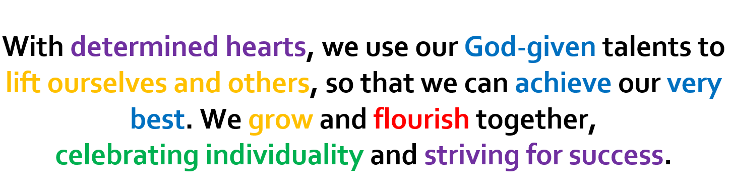 Our mission is to broaden horizons by utilising our God-given talents to support and uplift others through enrichment, nurture and challenge. We inspire our children to grow and flourish together, striving for success and contributing positively to our world.