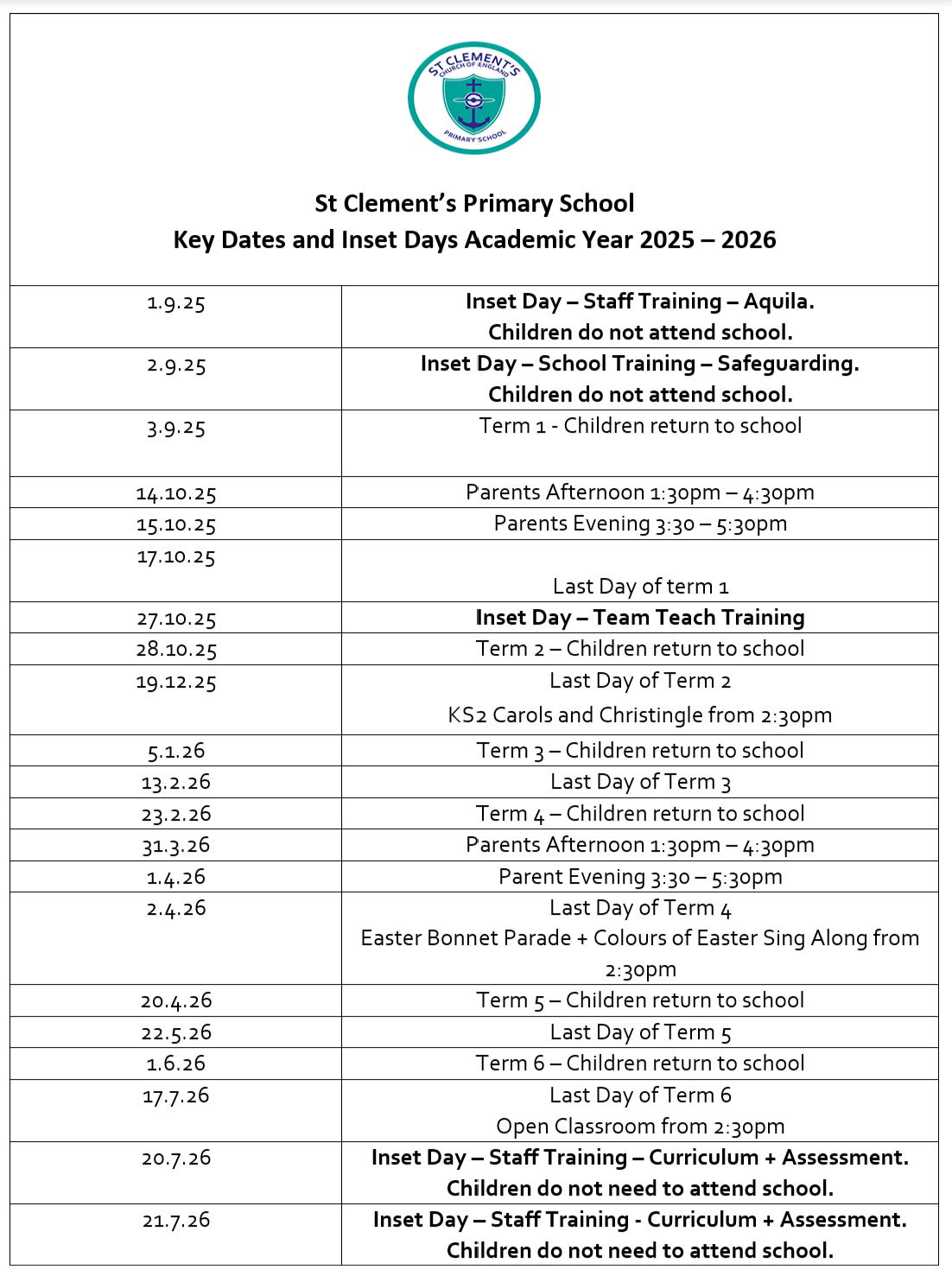 Our INSET dates are designed for staff development and training. On these days, children are not required in school.